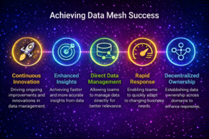 In summary, while Data Mesh offers significant advantages, organizations must carefully plan and prepare for these changes to successfully transition and realize the potential benefits. With decentralized data ownership, domain teams can respond more quickly to changing business needs without waiting for centralized approval, leading to faster time-to-insight.